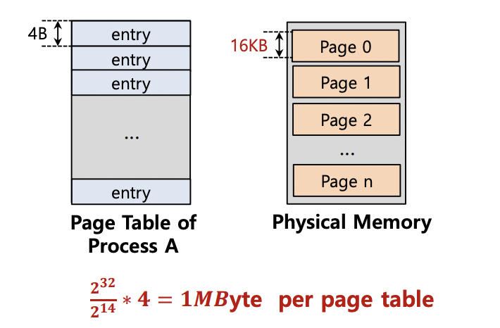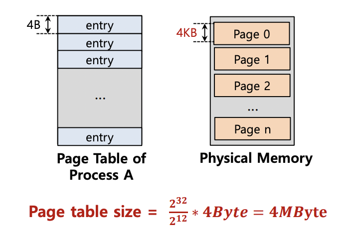 따라서 page table size는 2^32/2^12 * 4byte = 4MB가 되게 된다.