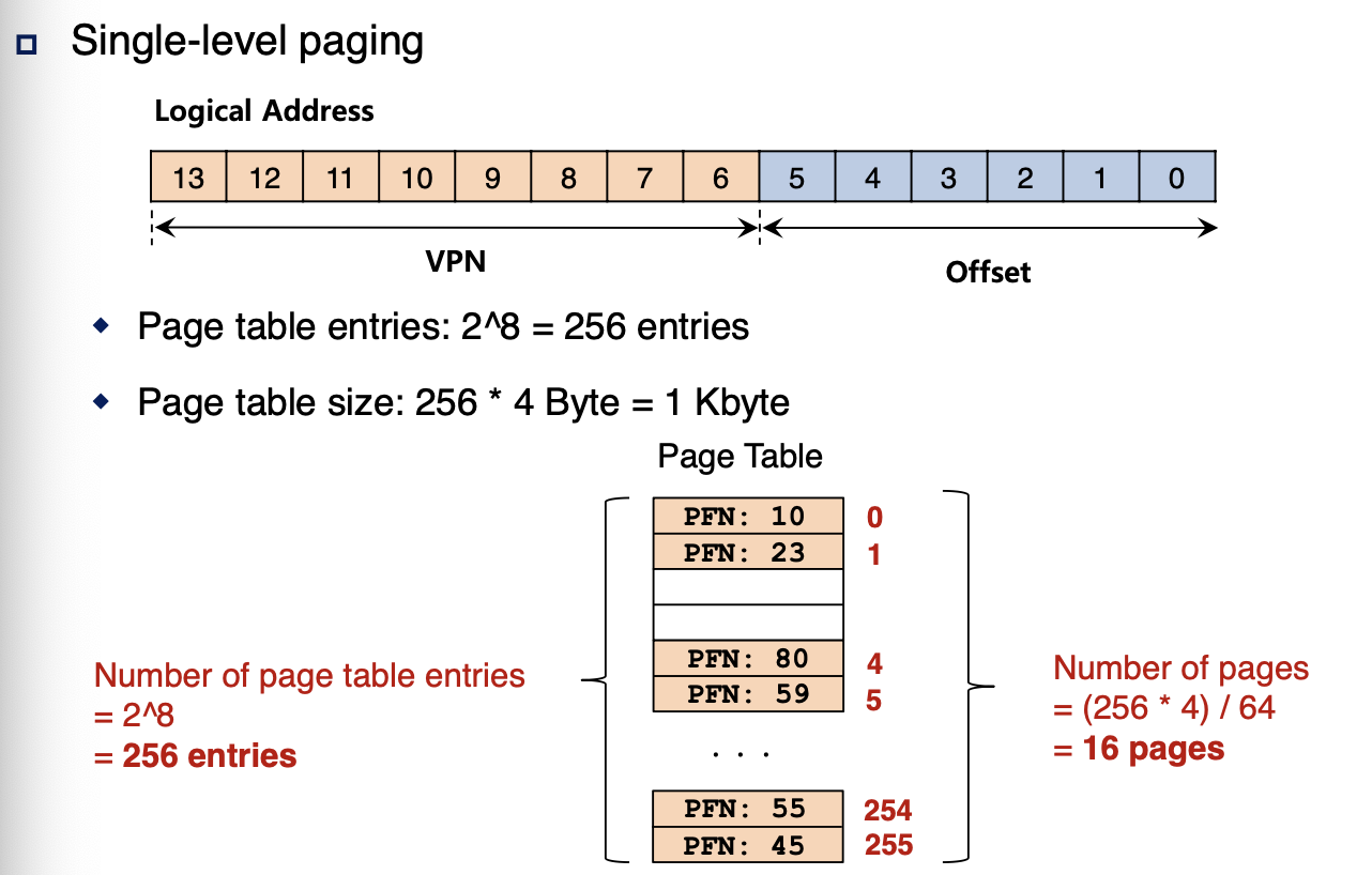 -하나의 page table entry 크기가 4바이트 라고 한다면 2^8x 4 = 1KB의 크기의 page table이 생성되는 것이다.
