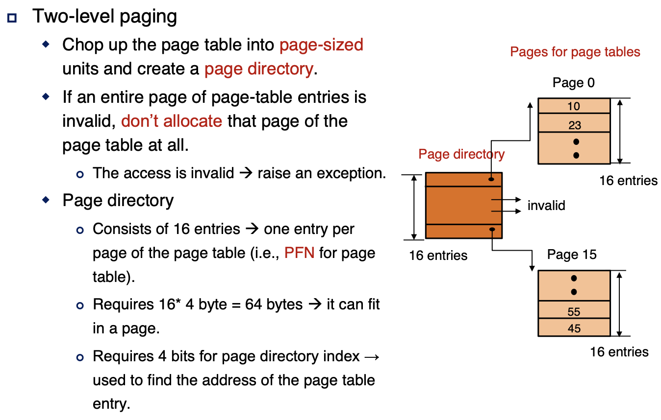 해당 page 중에 valid 한 page 영역을 track 하기 위한 또다른 page table을 만드는데 그것을 'page directory'라고 한다.