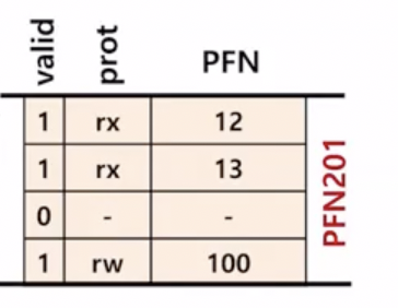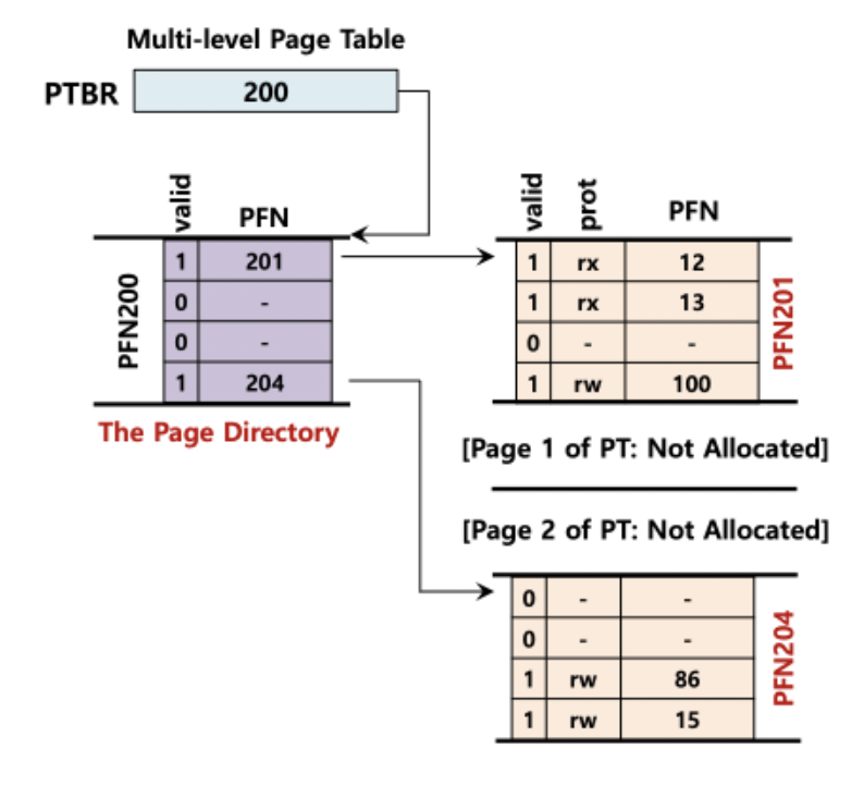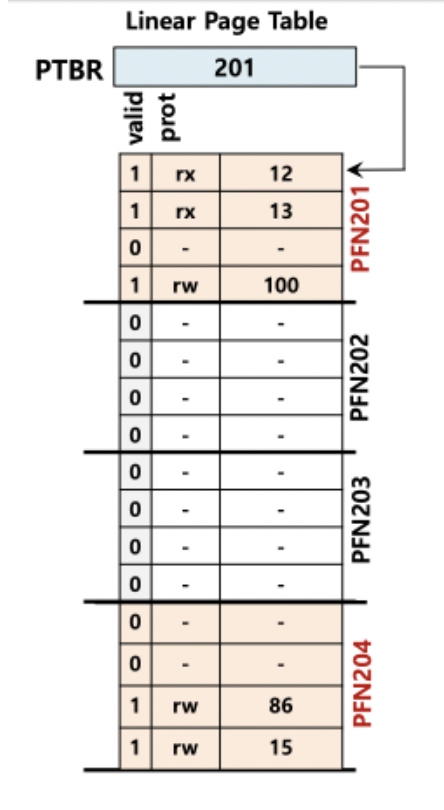 page directory에 적혀 있는 것은 valid 여부의 valid bit과 해당 page의 frame number (PFN) 값이 적혀있다.