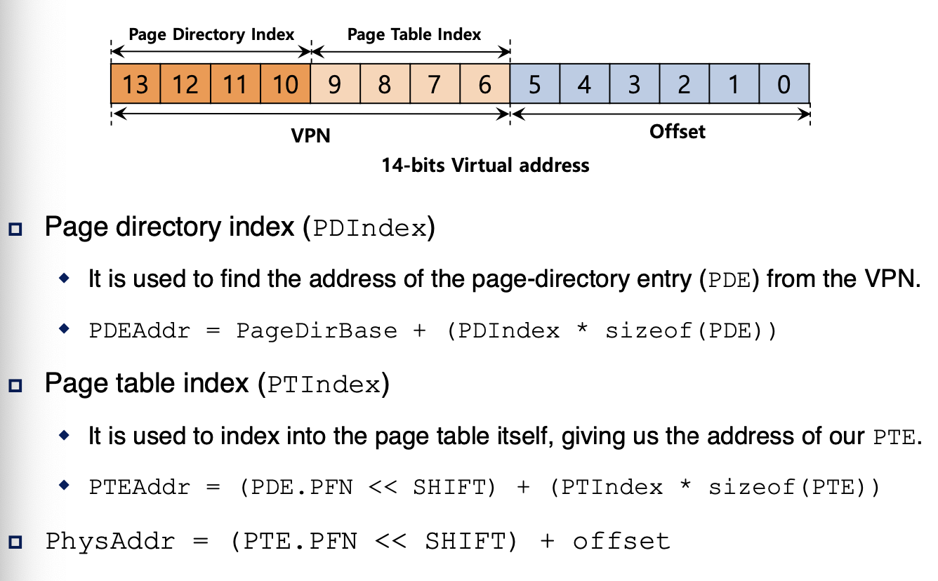 page directory는 하나의 entry에 하나의 page table의 page를 담고 있고 그 entry를 Page Directory Entry라고 해서 PDE라고 한다.