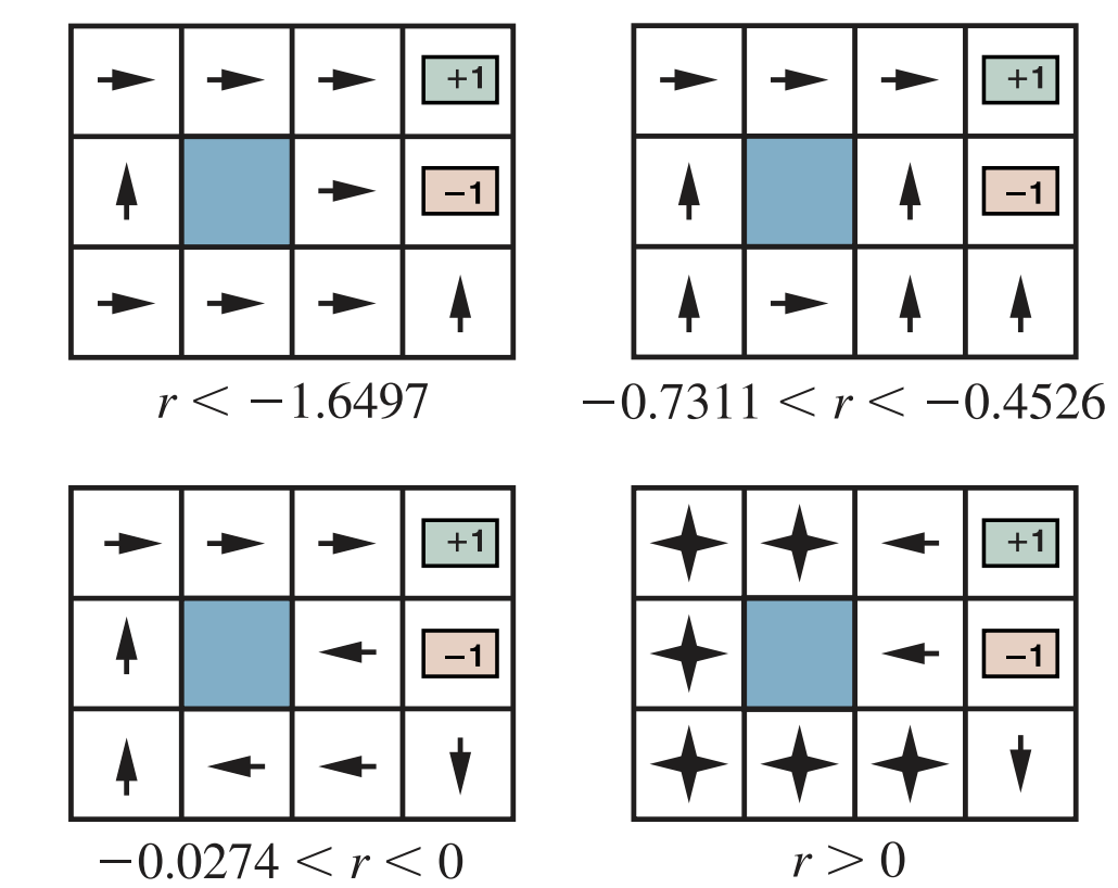 간단히 설명해 보자면 r 즉, reward 값이 작아질 수록 map에서 빨리 탈출하는 것이 좋으므로 terminal state로 가기 위한 경향이 강하게 나타나는 반면