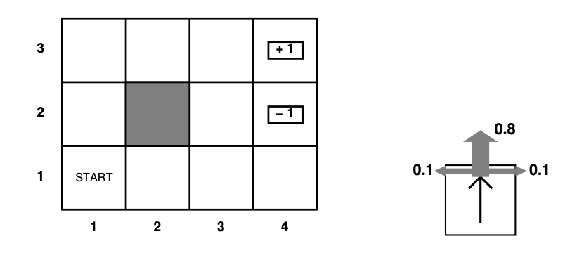 또한 세가지 방향으로 이동가능한데 전진, 좌회전, 우회전 각각 0.8, 0.1, 0.1의 확률로 선택된다.