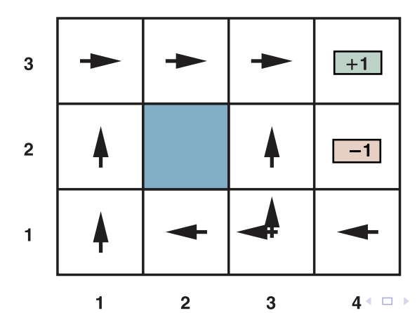 다음 그림은 terminal state를 제외한 state에서의 reward 값이 -0.04일 때의 optimal policy이다.