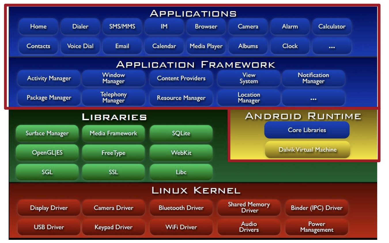 빨간색으로 칠해져 있는 part 가 바로 linux kernel 영역이고 , 안드로이드는 이 linux kernel을 기반으로 설계되었다.