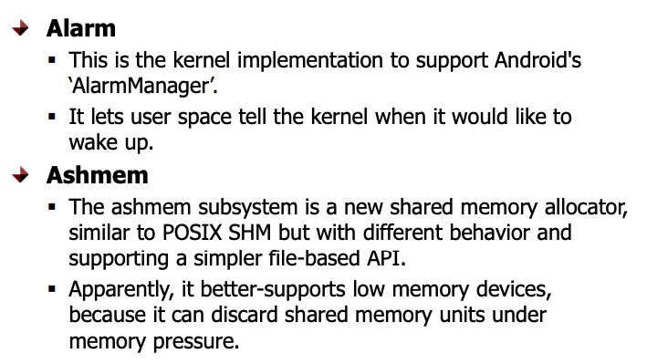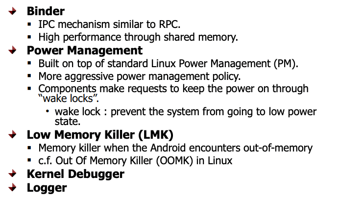 power management에 경우 기존 리눅스의 power management에 안드로이드에 필요한 기능이 더 추가 되었다.