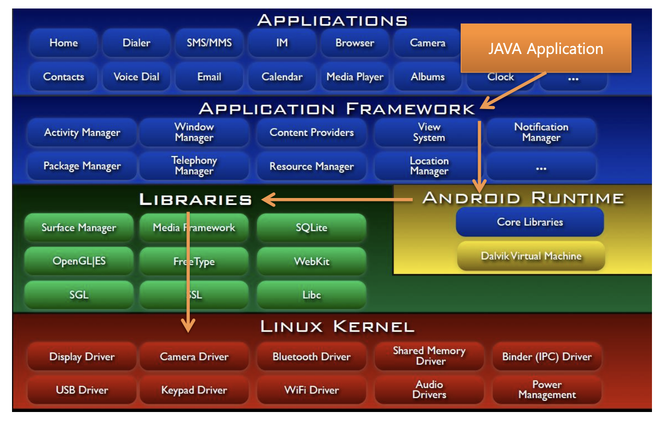 java application이 실행되게 되면, application framework 단을 거쳐, android runtime을 거쳐, library를 거쳐, kernel에 접근하게 된다.