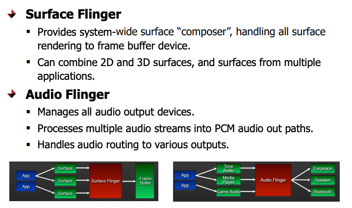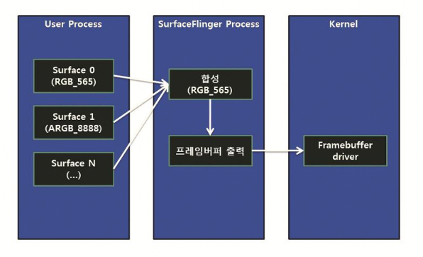안드로이드 사용자 인터페이스 구성 요소들은 SurfaceFlinger를 통하여 리눅스 커널에 위치한 LCD 디스플레이 드라이버인 프레임 버퍼 드라이버를 통해 그림을 그리게 된다.