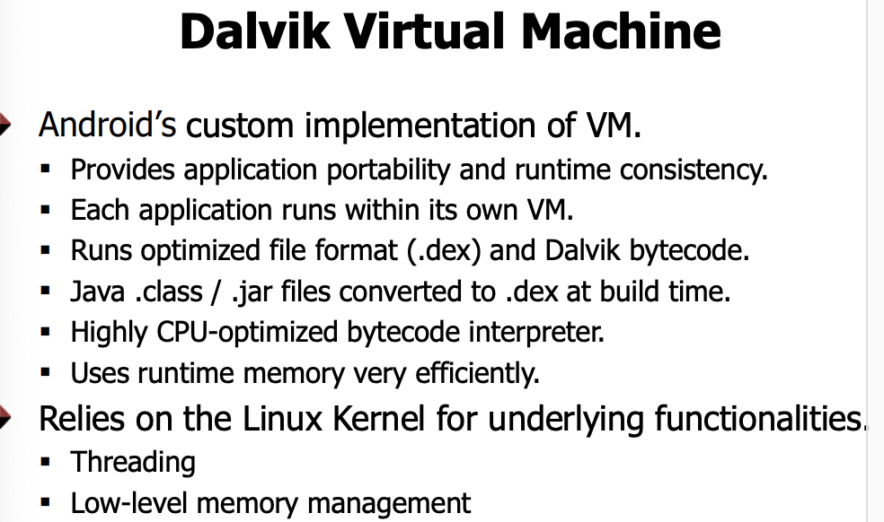 하지만 이러한 JVM은 모바일 기기 환경에는 최적화 되어 있지 않았고, 이에 모바일 기기 환경에 최적화 되어 가상 머신이 나오게 되었다.