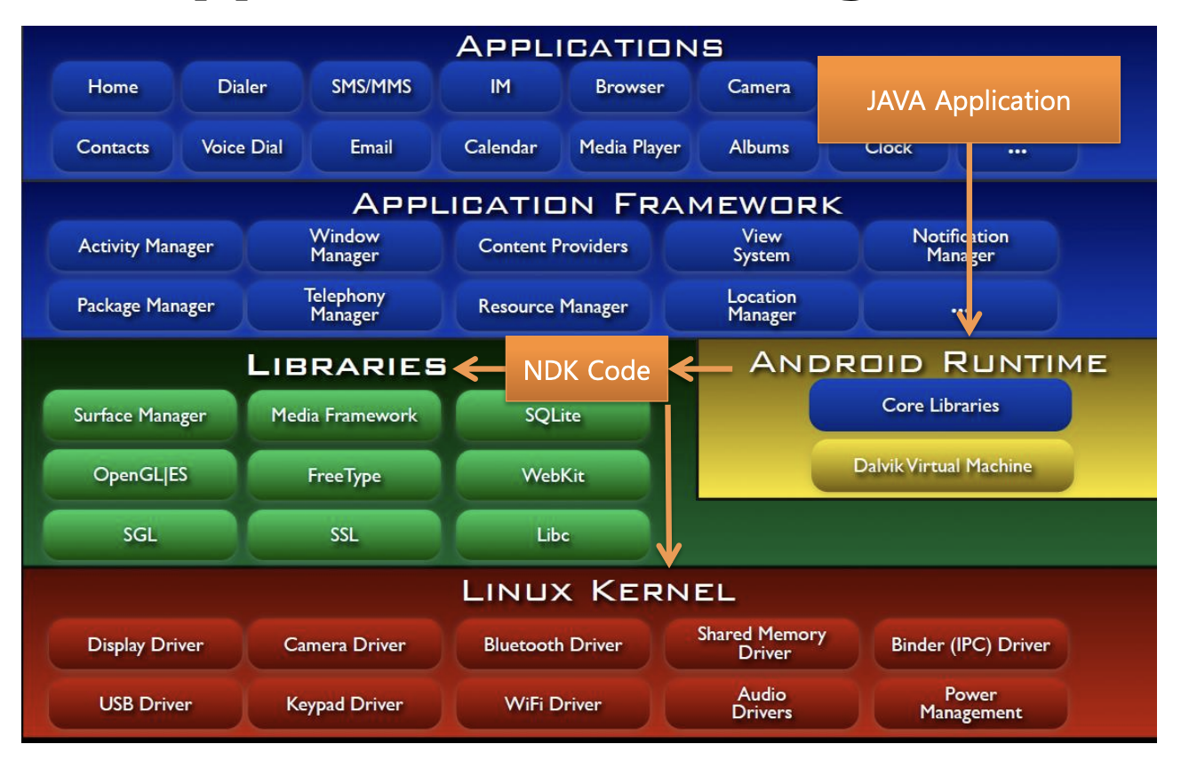 java application이 실행되게 되면, application framework 단을 거치지 않고, android runtime을 거쳐,ndk 코드를 이용하여