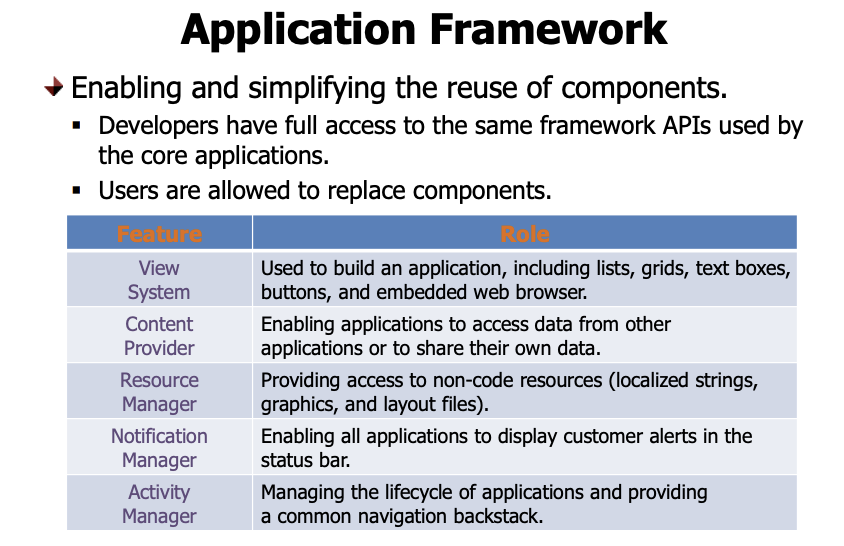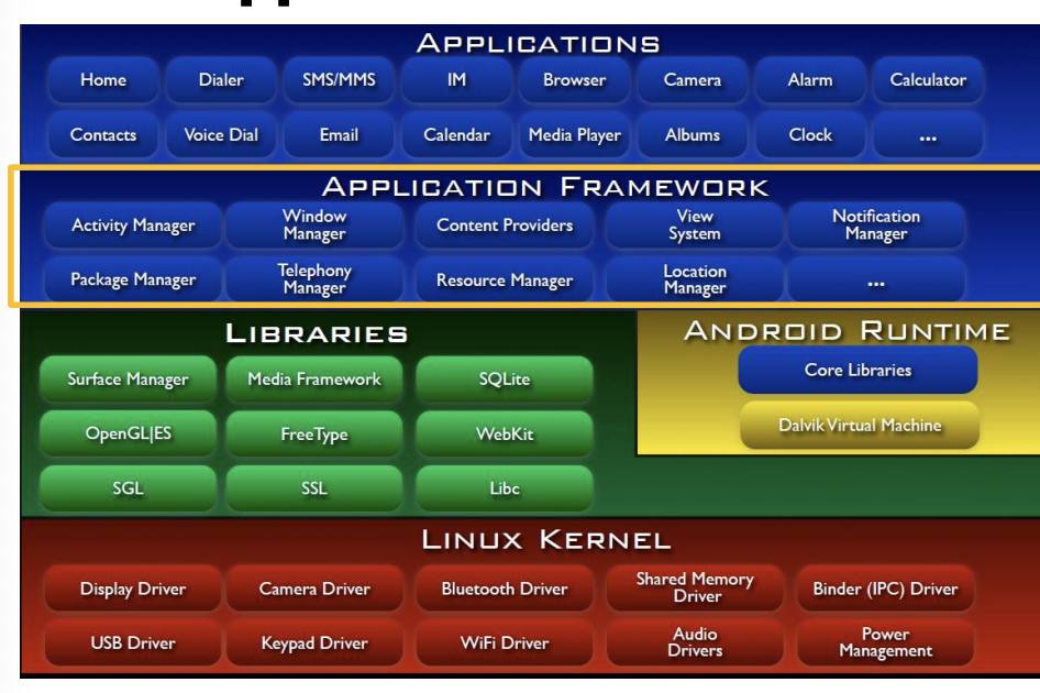 application framework는 안드로이드 아키텍처에서 다음에 해당하는 부분이다.