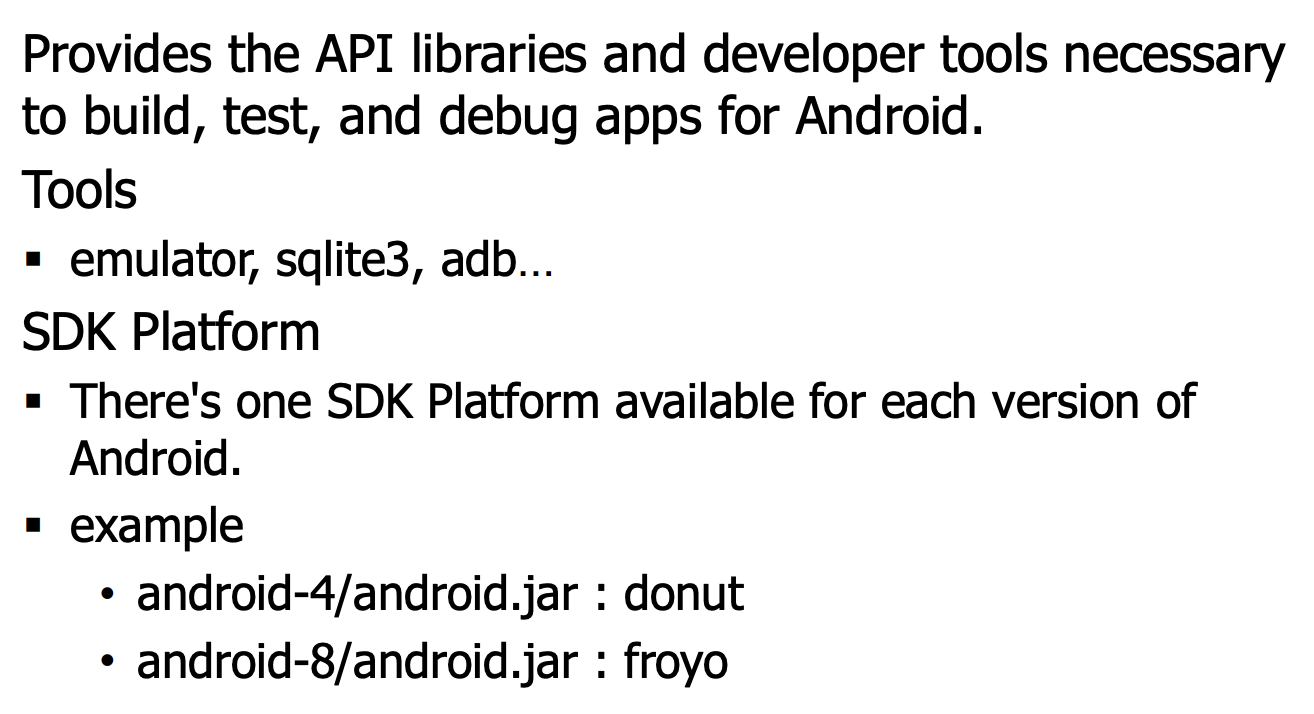 안드로이드 SDK(software development kit) 는 말 그대로 안드로이드 소프트웨어를 개발하기 위한 툴 킷을 의미한다.