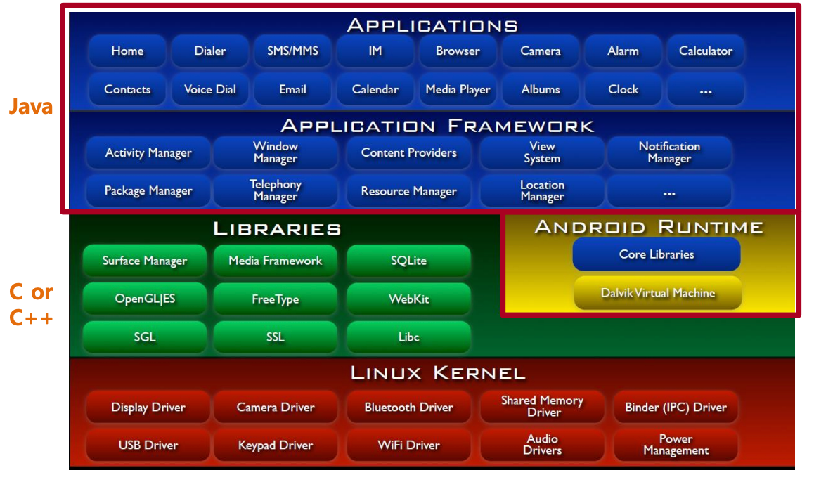 Application level, Application Framework level, Android Runtime level, Libraries level, Linux kernel level