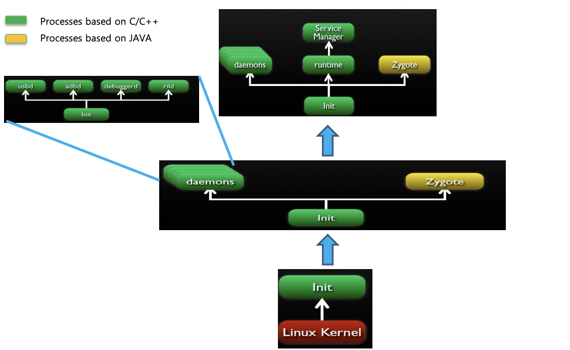 init process는 zygote process를 시작하고 runtime process을 시작한다.