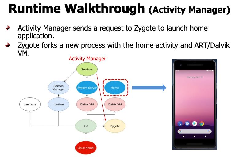 service 중 하나인 activity manager가 zygote에 main 화면을 그려주는 process(home application)를 띄워주도록 요청한다.