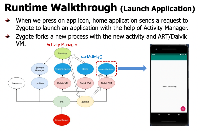 application 아이콘을 클릭 하게 되면 home application에서 startActivity()함수로 service manager에 activity manager을 요청하게 되고, activity manager가 해당 application을 띄울 수 있도록 zygote에 요청하게 된다. 이렇게 새로운 프로세스가 띄워지고 application이 실행되게 되는 것이다.