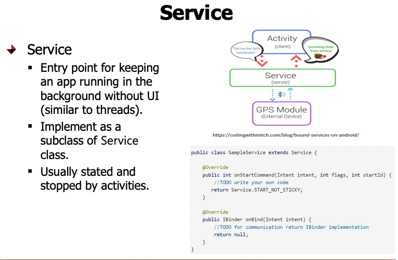 Service Manager 에 등록이 되어 있어야 하며 activity와 마찬가지로 기존에 있던 Service 클래스를 재정의 하여 사용한다.