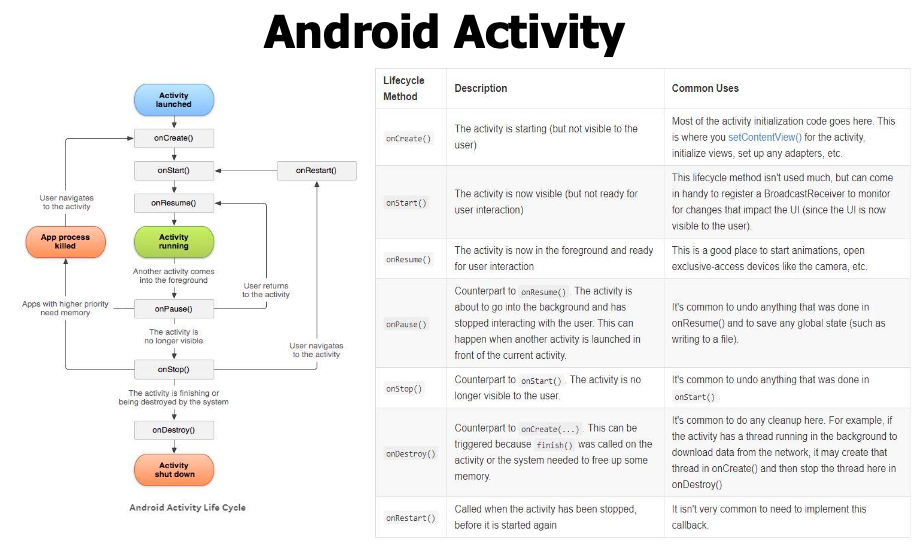 안드로이드 앱은 화면에 UI를 표시하기 위해 최소 하나의 Activity를 가져야 하며, 앱 실행 시 지정된 Activity를 실행하여 사용자에게 UI를 표시하게 된다.