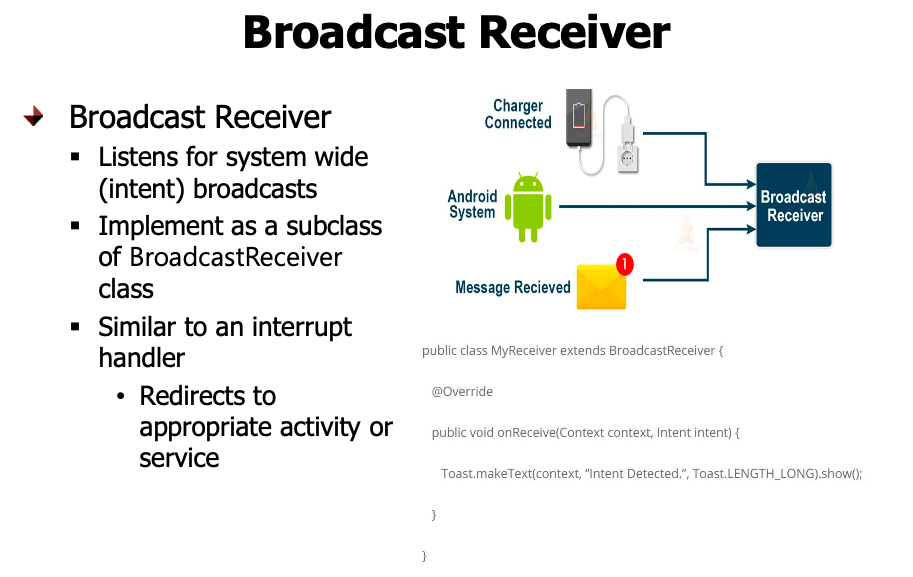 주요 시스템 이벤트에 관심 있는 애플리케이션들에게 통지하기 위해 안드로이드 시스템에 의해서 사용된다. 외부에서 입력되는 것을 받을 수 있게 끔 하며 예를 들어, 헤드폰 연결이 되거나, 전원 충전이되거나 할 때 상태변화 등을 감지하는 것이다.
