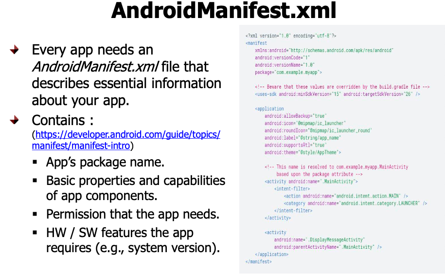 모든 app에 필요한 파일로 essential information을 가지고 있다. 필수 구성 요소로, 앱의 고유한 식별자인 패키지 이름, 필요한 권한, 구성요소의 정보가 포함되어 있다.