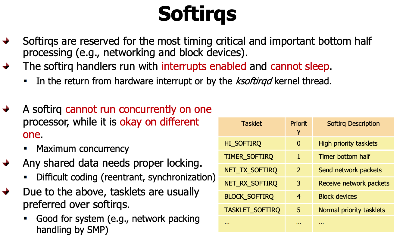 대부분의 경우는 tasklet으로 처리가 충분하지만, 네트워크 같은 성능이 아주 중요한 경우에는 softirq가 더욱 유용하다. 하지만 같은 softirq가 동시에 실행될 수 있으므로 사용 시 주의가 더욱 필요하고, 커널 컴파일 시에 정적으로 등록이 되어 있어야 한다.