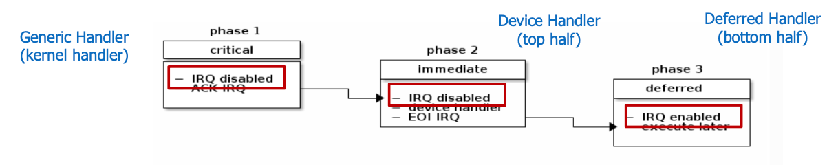 또한, interrupt handling 가 처리되는 동안은 모든 interrupt를 disable 하게 만들게 되는데 모든 hw 와 통신할 수 없게 되고, 이는 시스템 반응속도, 성능에 많은 영향을 미치기 때문에 가능한 빠르게 interrupt 처리가 진행 되어야 한다.