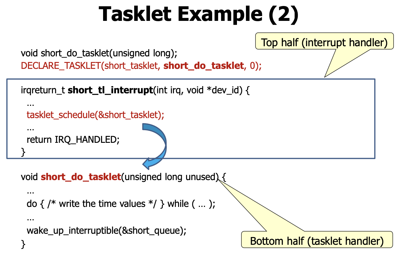하지만 interrupt handling는 비동기적(asynchronize)으로 실행되기 때문에 다른 interrupt handling를 포함한 다른 중요한 코드를 중단 시키게 되는데, 이 중단을 너무 오래 하면 안되기 때문에 가능한 빠르게 interrupt 처리가 진행 되어야 한다.