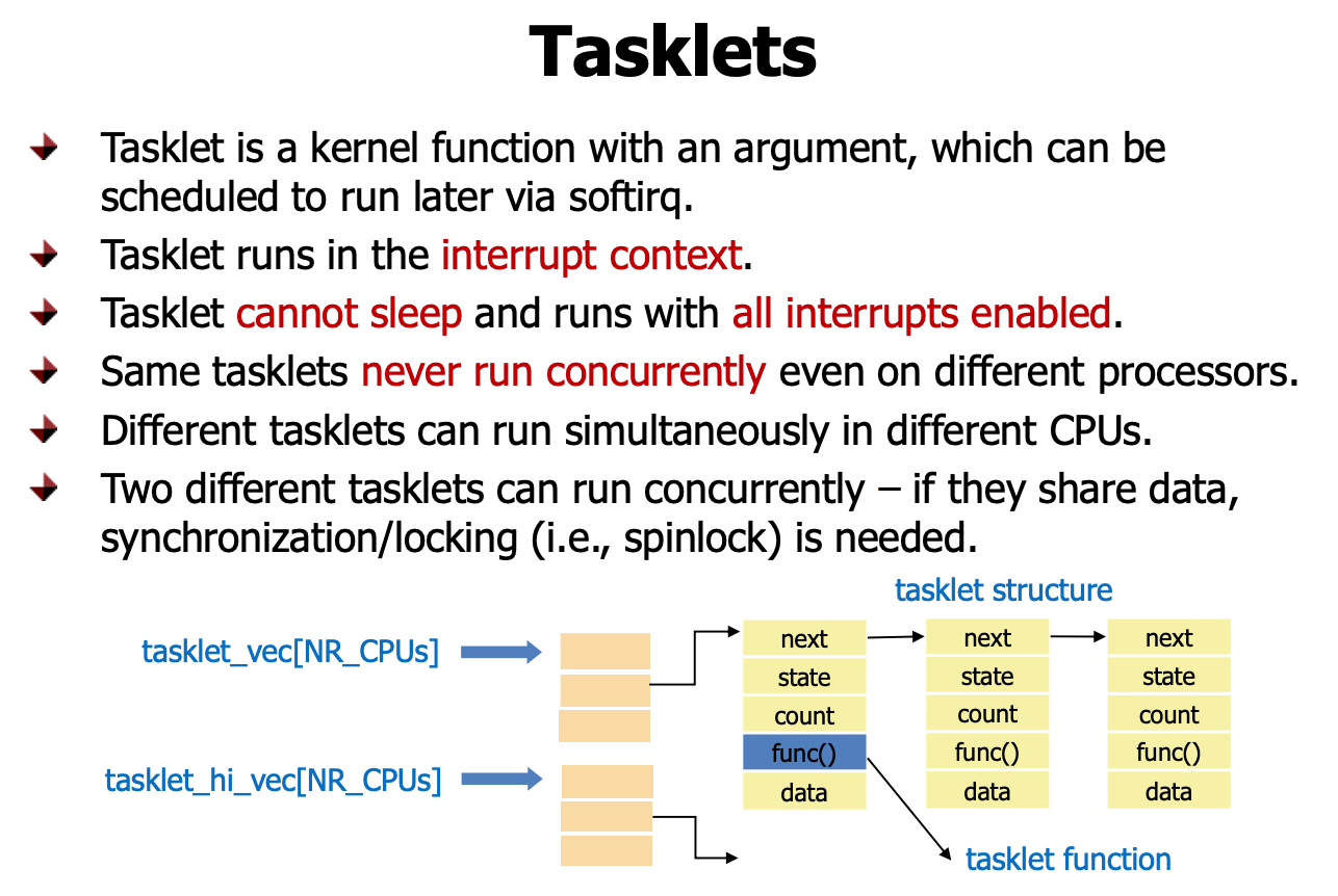 tasklet은 softirq와 유사하지만 더 간단하고 lock 사용 제한이 더욱 유연하다.