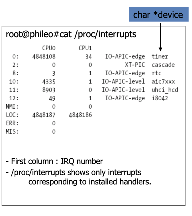 마지막 열은 interrupt를 사용하는 장치를 나타낸다. 공유 interrupt의 경우 사용 장치를 모두 나타내어 준다.