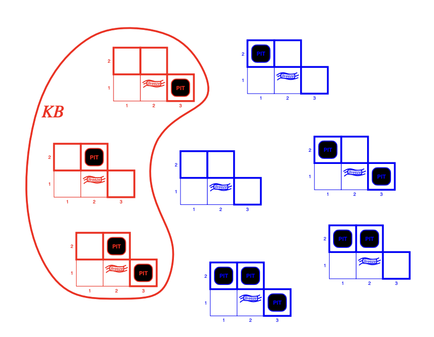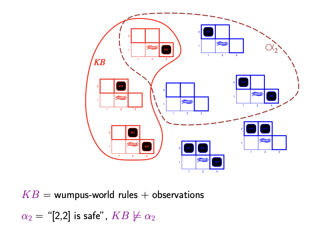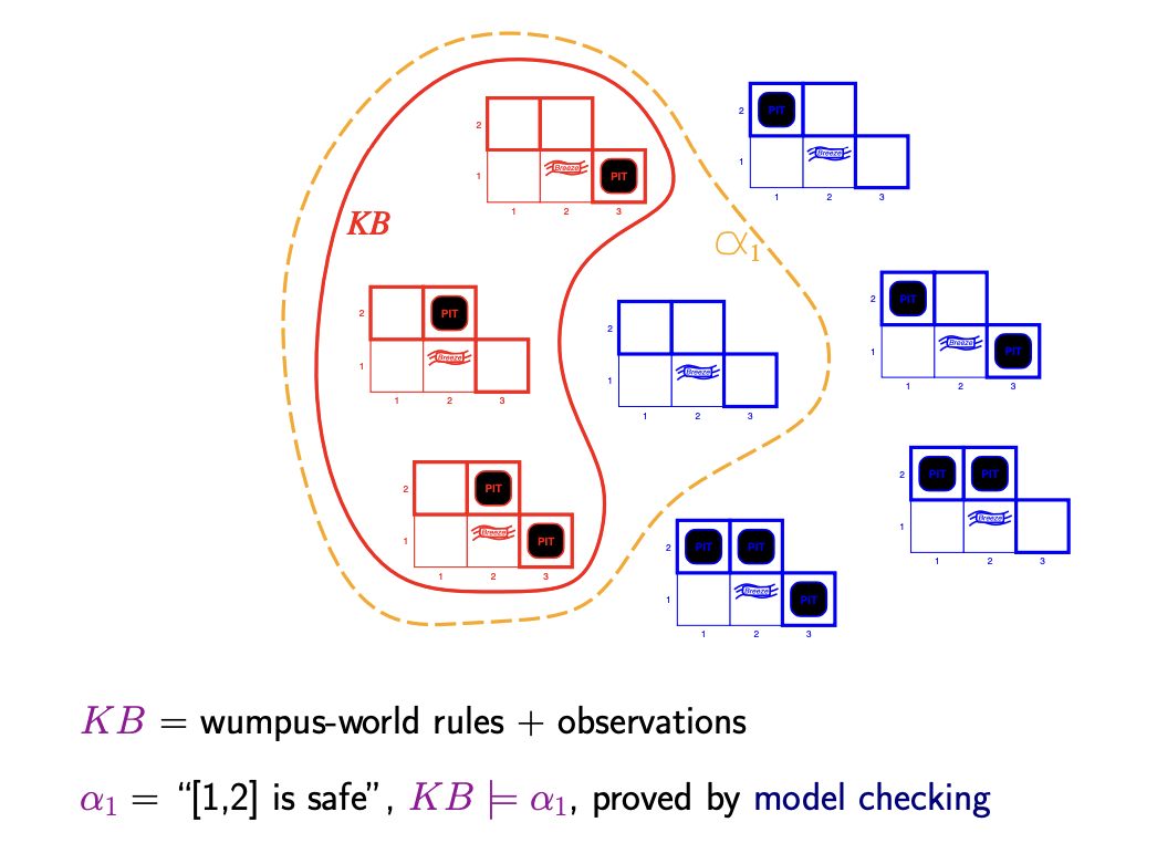 이때 KB = wumpus-world rules + observation이다. wumpus-world의 규칙과 관찰로 판단되는 경우는 3가지 뿐인 것이다.