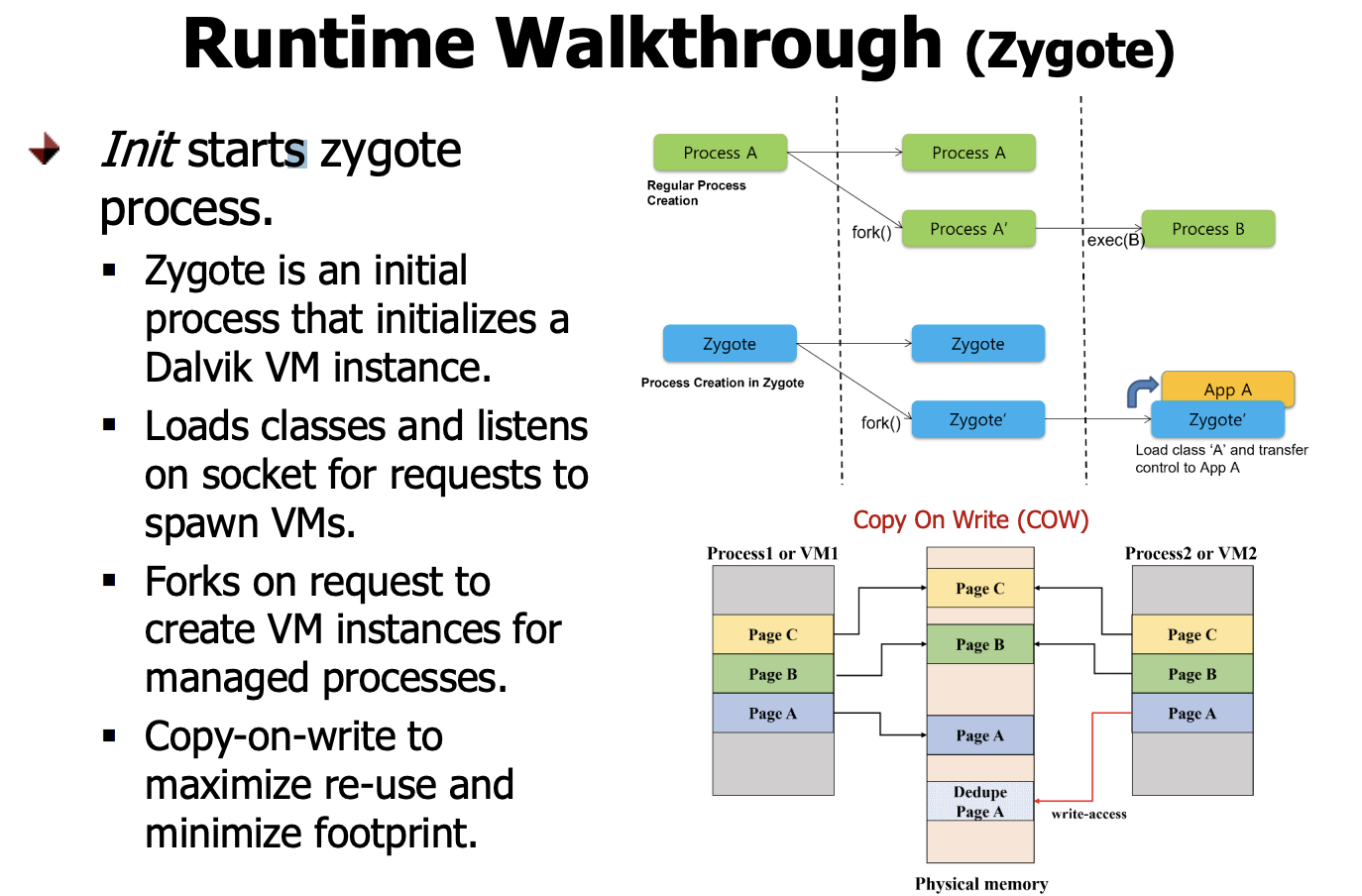 zygote 는 copy on write(COW)방식을 이용하여 재사용을 최대화 하고 footprint를 최소화 한다,