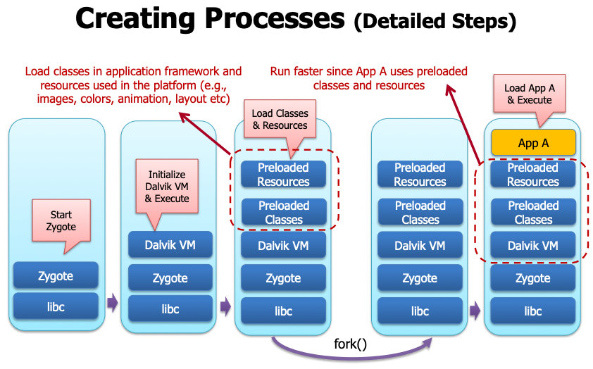 만약 zygote가 없다면, application 실행시 .apk dex file 을 돌려주려주어야 하는데 process안에 dex file이 돌아가는 환경 dvm, art가 필요하고, 이외에도 여러 이미지 library도 필요하게 된다. 이러한 것들을 모두 application 실행할 때 마다 setting 하고 loading 하게 되면 시간이 상당히 오래 걸리게 된다.